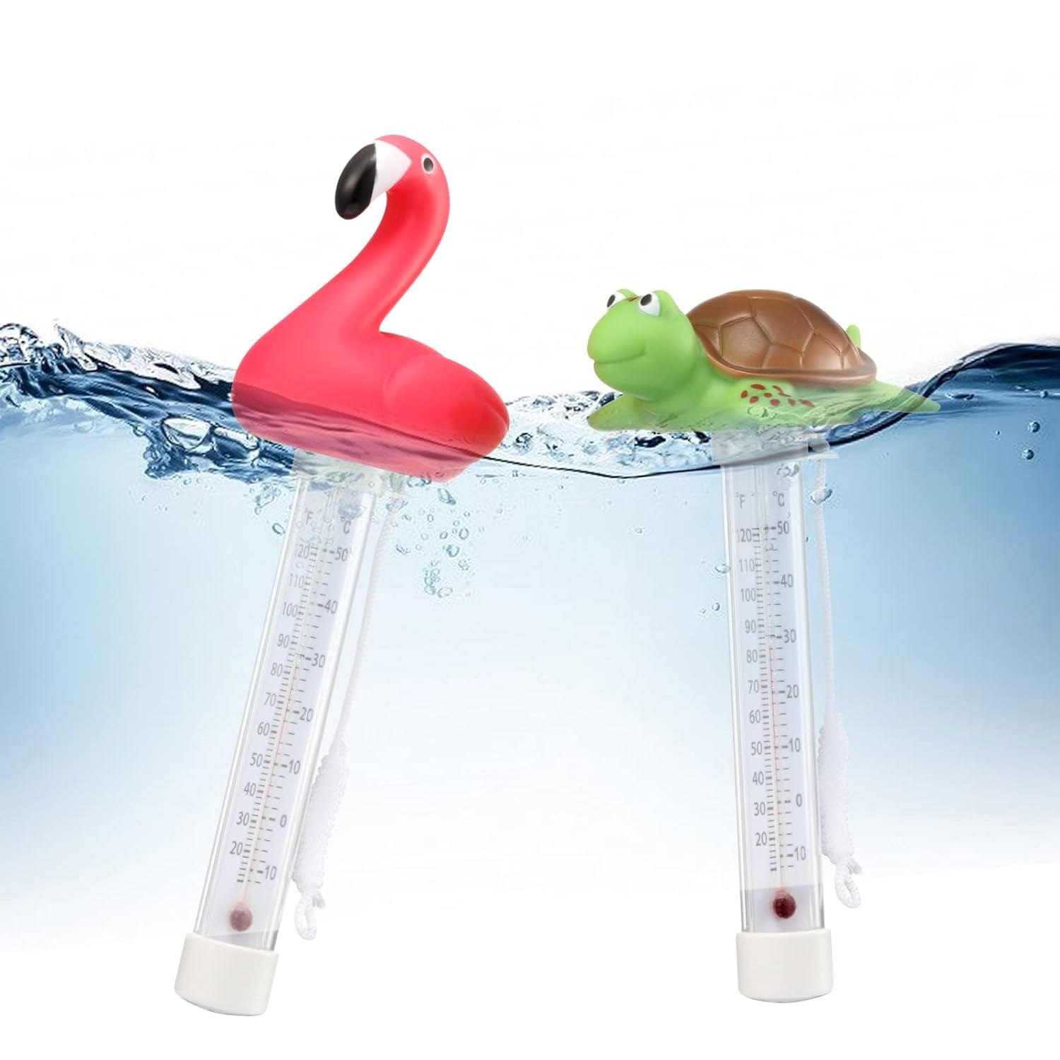• 2 In 1 Pack: Each set has 2 Floating Pool Thermometers. One is Flamingo design and the other is Turtle design. Both are cute and great decoration