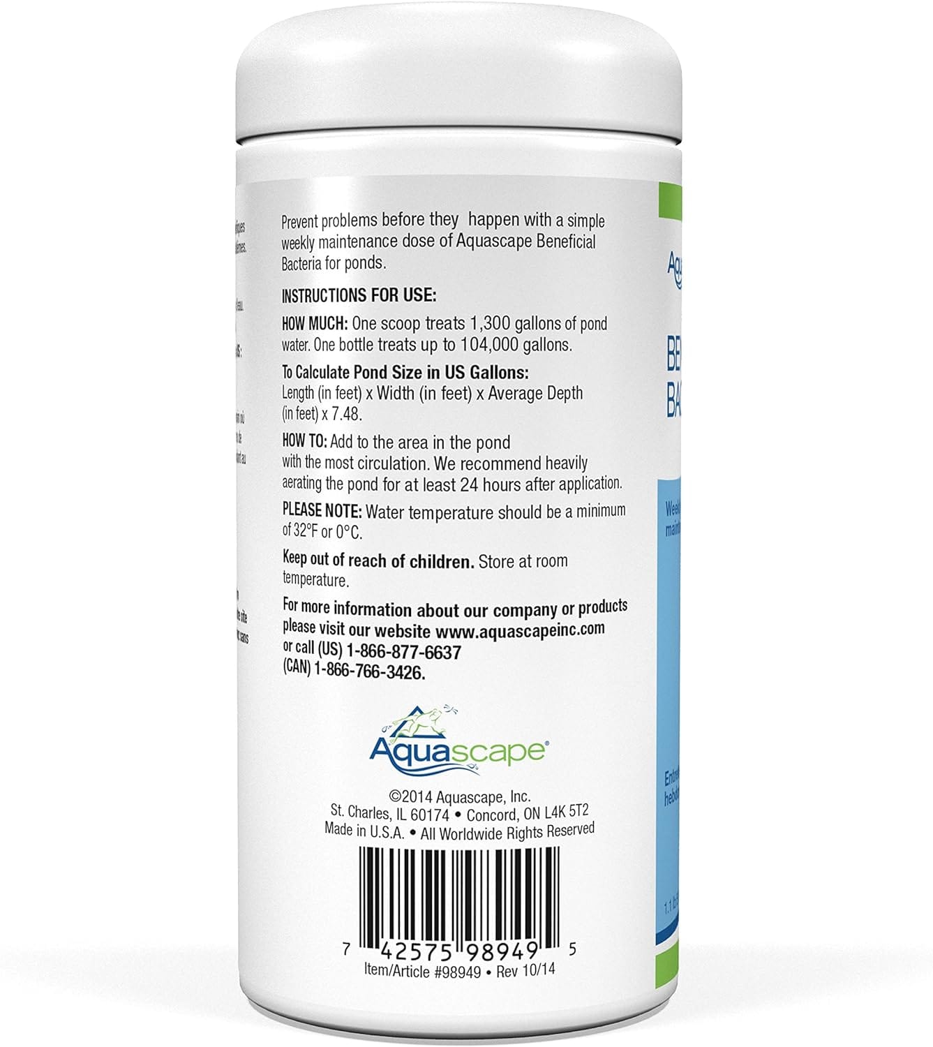 The Aquascape Dry Beneficial Bacteria for Ponds helps to provide clean, clear, and healthy water conditions, significantly reducing pond maintenance required. Each container of Aquascape Beneficial Bacteria is packed full of eight pure strains of concentrated bacteria and is completely safe for fish, plants, pets, and wildlife. Aquascape’s Beneficial Bacteria will effectively reduce fish waste, organic plant material, sludge, and excess nutrients in your pond, allowing you to spend more time enjoying your water feature and less time maintaining it. Aquascape Dry Beneficial Bacteria contains a 3.0 billion CFU per ounce potency, ensuring consistently effective treatment, and the included marigold and vitamin B helps to bring out the natural colors of your fish while maintaining proper fish health. The included easy-to-use scoop measures 1,300 gallons of treatment per scoop, making application simple. Aquascape is passionate about the products we produce, providing unique products, designs, and features that stand above the competition.