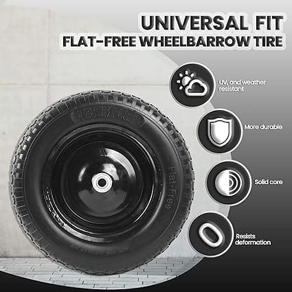 - MAXIMUM 300 LBS LOAD CAPACITY – Haul without worries as these flat-free tires can safely accommodate up to 300 pounds of weight and tackle any terrain all year round. This is the maximum weight for the entire assembly, including the polyurethane tires and metal rims