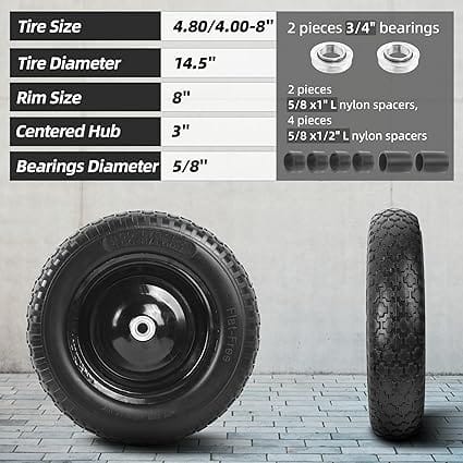 Be the first to review “AR-PRO 4.80/4.00-8″ Flat Free Tire – 14.5”D x 3.2”W Universal Solid Wheelbarrow Tire with 3” Hub and 5/8” Bearings – Extra Adapter kit includes 3/4” Ball Bearings, 1” and 1/2” Nylon Spacers” Cancel reply
