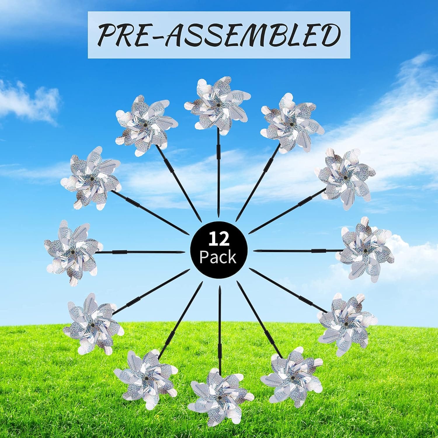 - Pre-assembled Pinwheels: No need to spend time learning how to assemble the pinwheel. They are already installed! Only need to connect the plastic stakes.