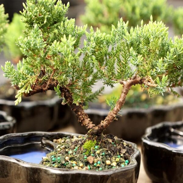 - SPECIES: The Juniper is a low growing plant, producing lush greenery and small, firm, silvery blue berries atop interesting bark that adapts well to several creative forms of Bonsai bark manipulation.