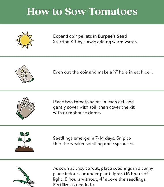 - SEED STARTING TIP: Sow tomato seeds indoors 6-8 weeks before average last frost date using a Burpee seed starting kit. Transplant seedlings into your home garden after all danger of frost. Make sure to harden off your tomato seedlings by leaving them outdoors in their containers up to a week before transplanting. Plant Height is 48-60″; spread is 18″.