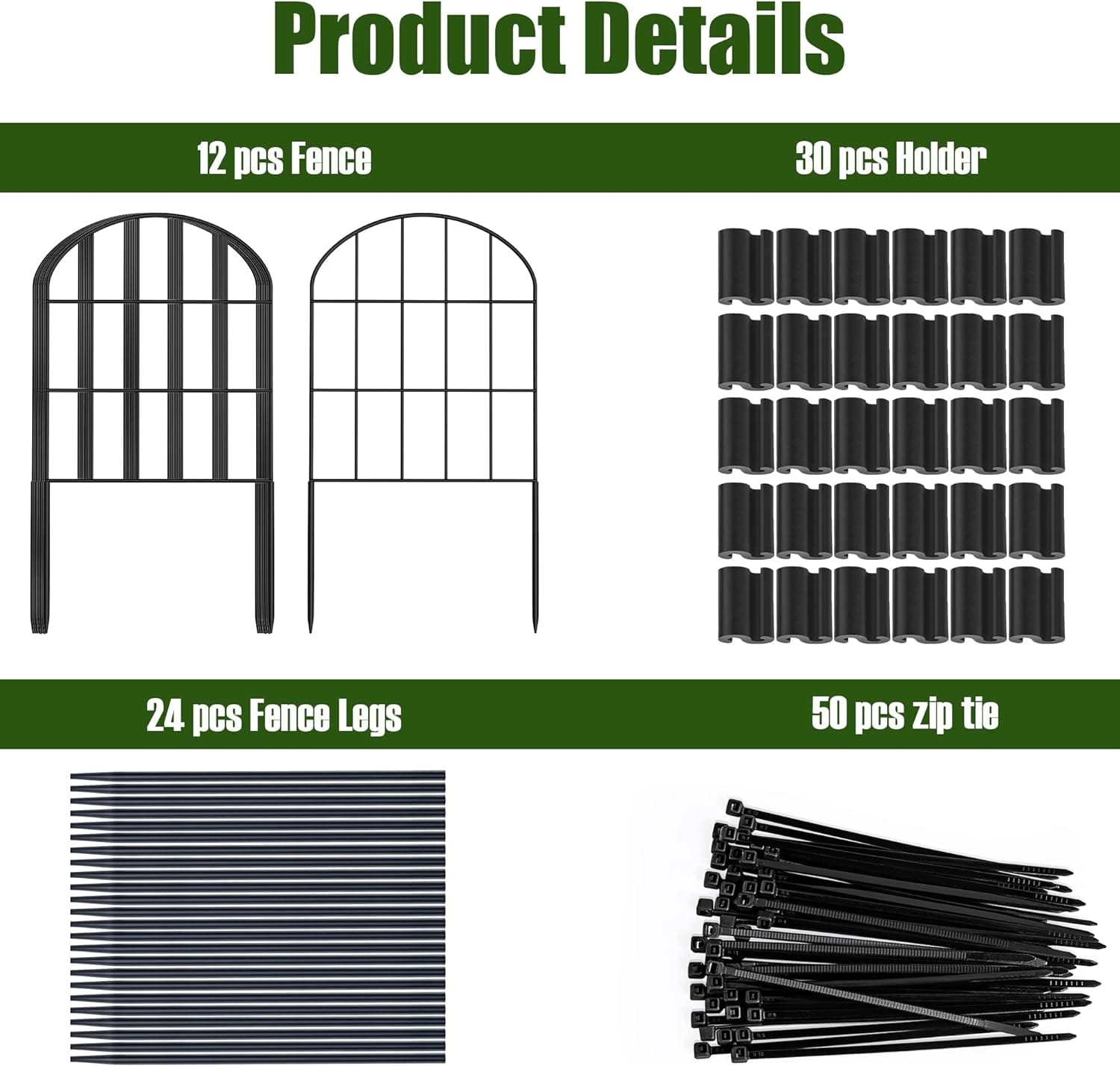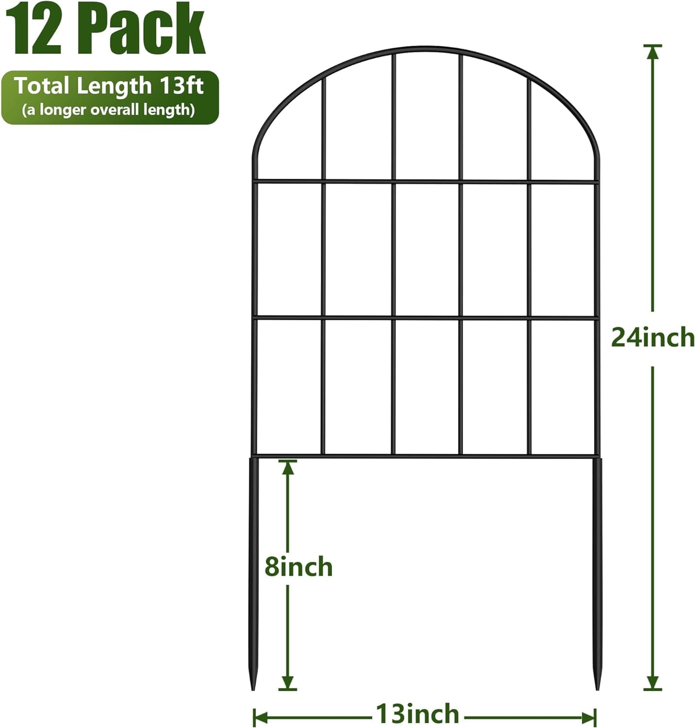 - 𝐏𝐫𝐨𝐝𝐮𝐜𝐭 𝐃𝐢𝐦𝐞𝐧𝐬𝐢𝐨𝐧: Decorative metal garden fence with single panel size 24″ high x 13″ wide, 12 Panels in total. The whole length is 12ft long. You will get 12 Pack no dig fence, 30 Snaps, and 30 cable zip ties.