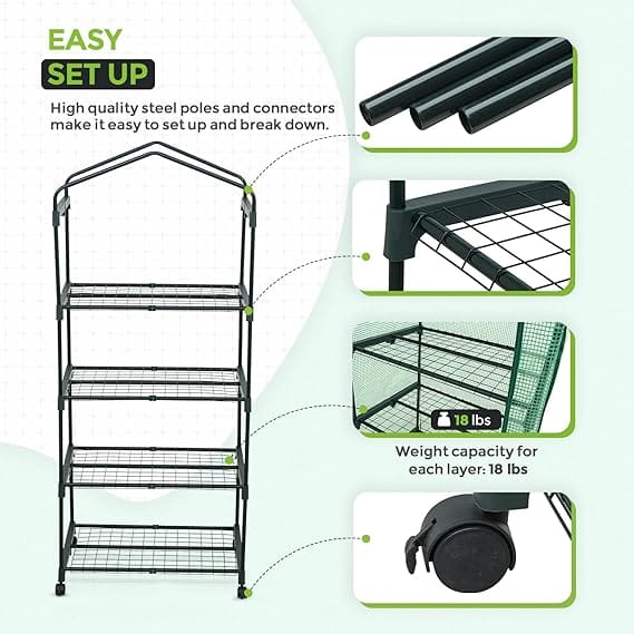 • EXCELLENT QUALITY: The green cover is waterproof, UV-protected thick polyethylene (PE), designed to trap heat with maximum solar performance. The greenhouse frame and shelves are sturdy, and constructed with heavy-duty powder-coated steel pipes.