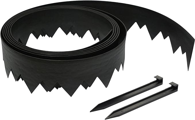 - KIT INCLUDES: 20 foot serrated coil of black landscape edging and (2) heavy duty anchoring stakes to keep the ends of the edging in place