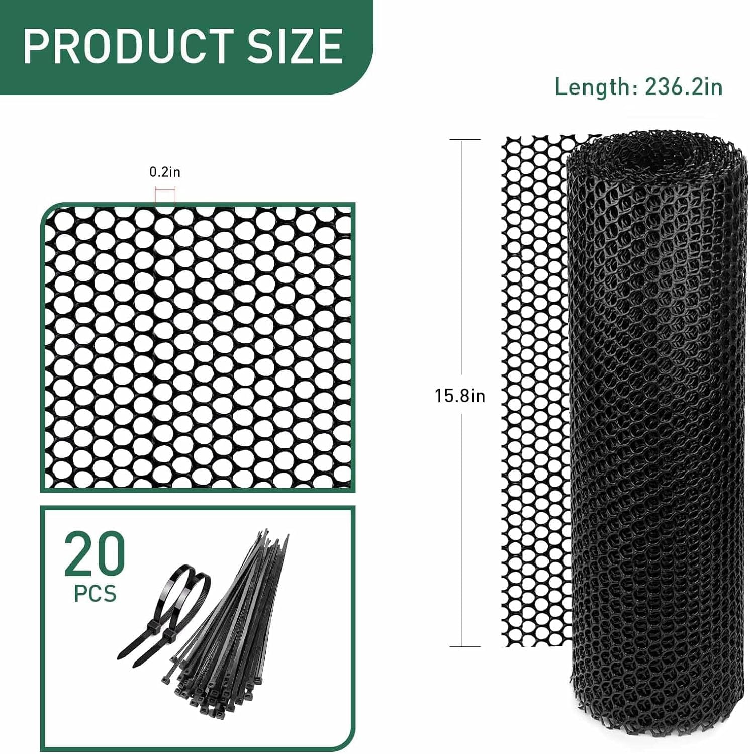 - Tamaño grande fácil de usar: el gran tamaño de 15.7 pulgadas x 19.7 pies se puede cortar al tamaño que necesites, y se incluyen múltiples lazos giratorios. Con un diseño de malla de plástico, nuestro alambre de pollo de plástico es ligero y fácil de cortar, dar forma e instalar para sus necesidades. Se puede cortar rápidamente a medida con tijeras regulares o cortadores de alambre.