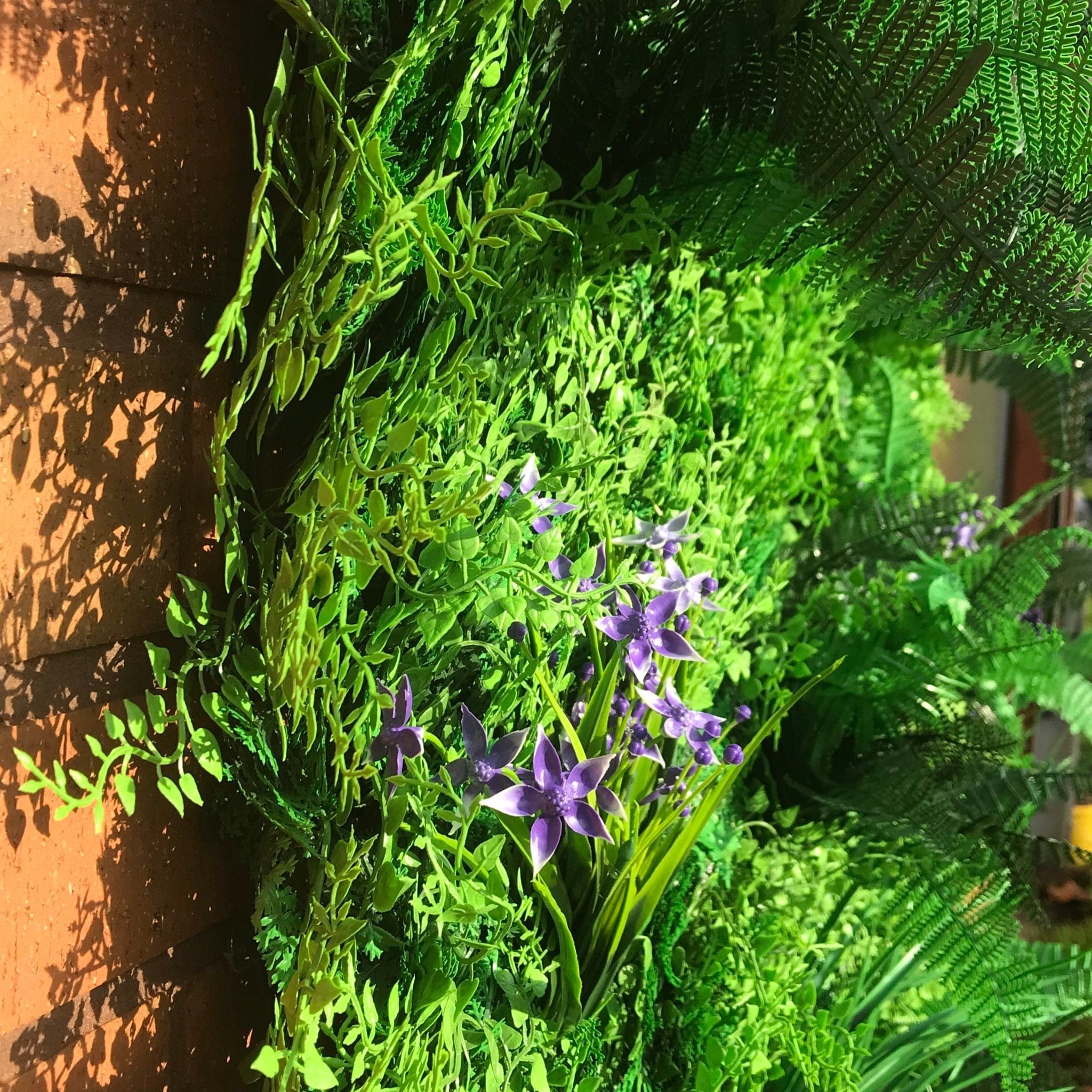 An extended artificial green wall is composed of multiple leaves combined to create a luxurious look. It has dense coverage. This plastic hedge panel selects old and new leaves, adding lush grasses and ferns for density. Our interlocking tree branch panels come in 100 x 100cm square tiles. They can be assembled directly to your exact dimensions. Shipped in two 100×50 cm pieces per square meter to save on shipping costs.