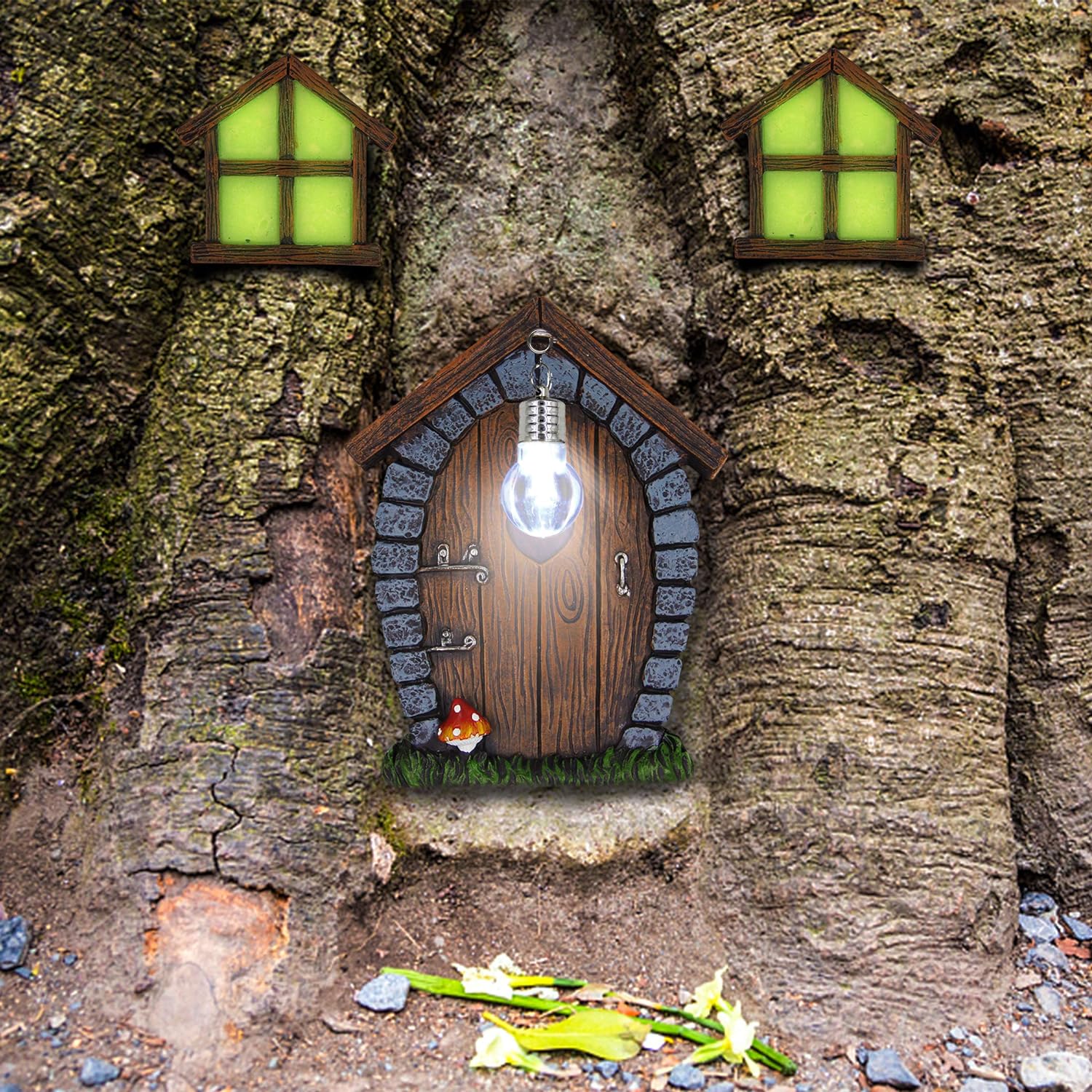 - [Miniature Fairy Garden Door Windows]: The fairies are looking for home. Hang these delicate door and windows on the trees in the yard and invite the fairies to stay here. The windows glow in dark and the door with a litter lamp in front of it.