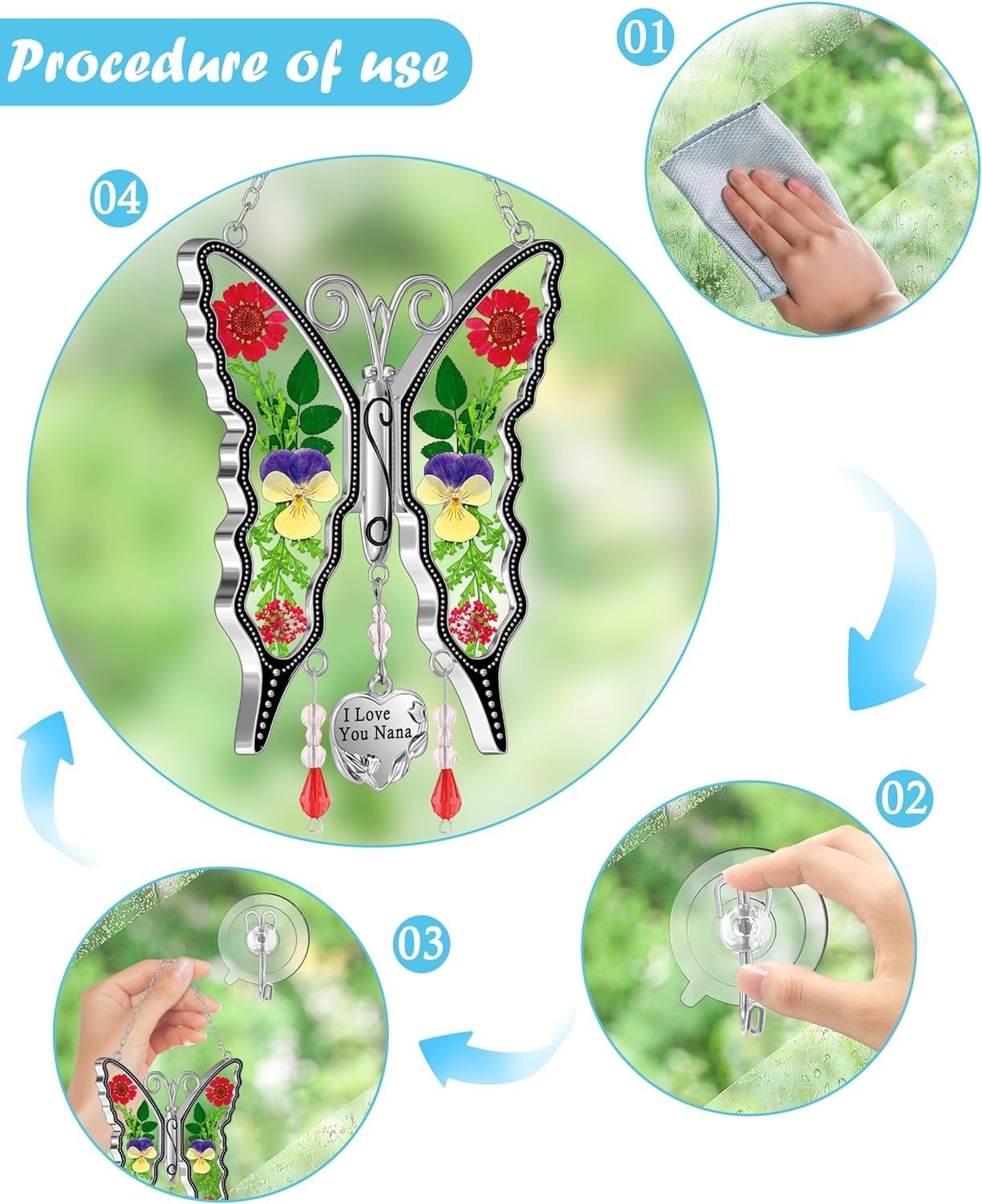 - ✅【Detail】:The frame of the Stained Glass Butterfly suncatcher is made of electroplated silver & zinc alloy Glass, Real flower material, which is firm and textured, really dried flowers pressed between of wings Embedded in Glass, The dried pressed flowers are adopted from nature, so that would be slightly different for each one, three lavender pendants on the bottom, one of the pendants has a heart-shaped tag hanging on it, which is engraved with “I Love You Nana”, it’s a nice gift to express;