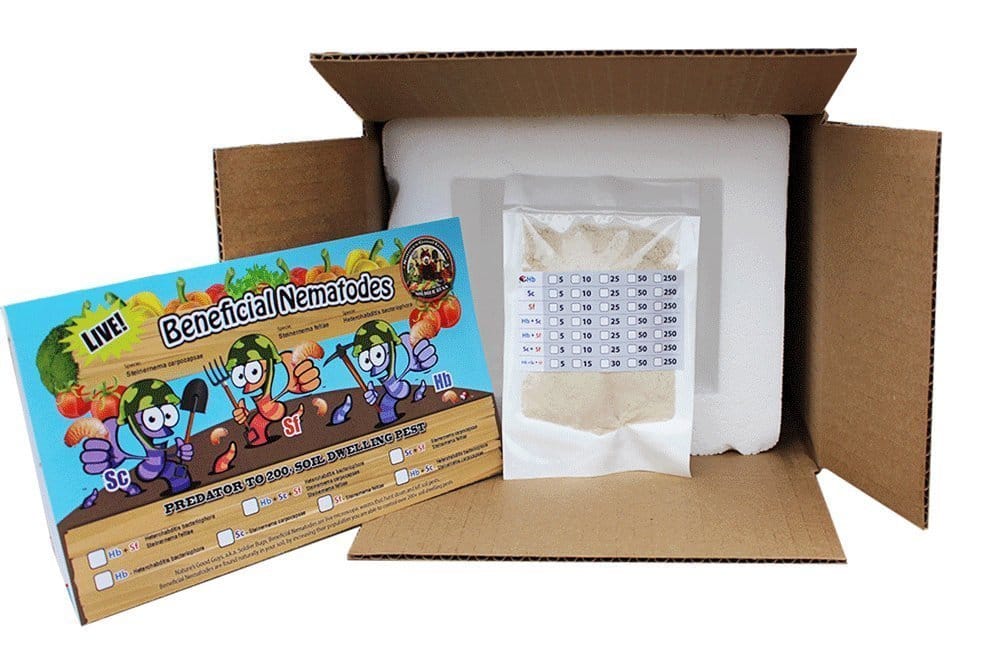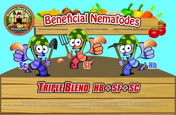 Natures Good Guys, Soldier Bugs Each package contains a mixture of 3 species of nematodes:+Hb (Heterohabditis bacteriophora) +Sc (Steinernema carpocapsae) +Sf (Steinernema feltiae) Triple Blend Beneficial Nematodes work on; Japanese Beetles, Thrips, Maggots, Lawn Grubs, Fungus Gnats, Chiggers, Moths, Fleas, Flea Beetles, Ants (Queen), Asparagus Beetles, Armyworms, Artichoke Plume Moths, Bad Nematodes, Bagworms, Banana Moths, Banana Weevils, Berry Root Weevils, Beet Armyworms, Berry Root Weevils, Bill Bugs, Black Vine Weevils, Black Cutworms, Bluegrass Weevils, Borers, Cabbage Maggots, Carpenter Worms, Borers –Iris, Tree, Vine, Carrot Weevils, Caterpillars, Chafers, Chinch Bugs, Citrus Weevils, Codling Moths, Chafers, Citrus Weevils, Colorado Potato Beetles, Corn Root Worms, Corn Borers, Corn Earworms, Cotton Bollworms, Cranberry Girders, Cranberry Root Weevils, Crane Fly Larvae, Crambids, Crate Flies, Cucumber Beetles, Cutworms, European Chafers, Fall Armyworms, Flea Beetles, Fleas –Adult, Fly Larvae, Fire Ants, Fleas, Fly Larvae, Fungus Gnat, Fruit Flies, Gall Midges, Girdlers, Grape Root Borers, Grubs, Gypsy Moths, Humpbacked Flies, Hylobius Weevils, Japanese Beetles, June Bugs, Large Pine Weevils, Lawn Grubs, Leaf Miners, Leather Jackets, Masked Chafer, May/June Beetles, Mint Borers, Mint Flea Beetles, Mint Root Borers, Mole Crickets, Mushroom Fly Larvae, Navel Orange Worms, Onion Maggots, Pill Worms, Poplar Clear Wig Borers, Raspberry Crown Borers, Roaches, Root Aphids, Rootknot Galls, Root Weevils, Scarabs, Sclarids, Shore Flies, Sod Webworms, Squash Vine Borer Larvae, Subterranean Termites, Strawberry Root Weevils, Sugar Cane Stalk Borers, Sweet Potato Weevils, Termites, Thrips, Ticks, Tobacco Budworms, Tobacco Cutworms, Webworms, Weevil Grubs, Wireworm Aphids, Wireworms, Wood Borers, Wooly Aphids and More!