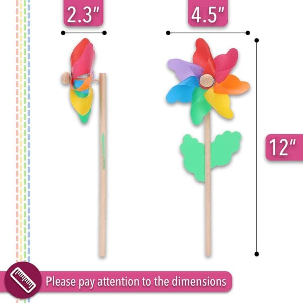 - Each rainbow flower pinwheel measures 12″ in length and 4.5″ in width. Plant these lovely pinwheels in the garden or front yard for a fantastic visual effect.