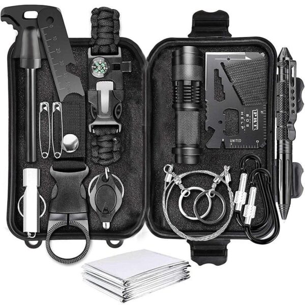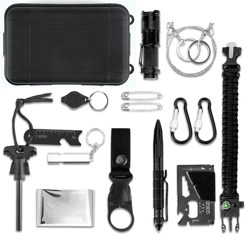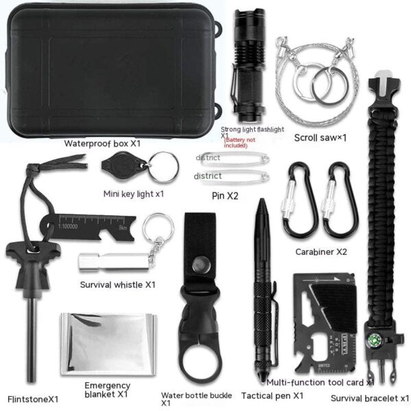 Torch X1 Waterproof case X1 Wire saw X1 Mini Key Light X1 Pins X2 Mountaineering Buckle X2 Survival Whistle X1 Multi-function tool card X1 First Aid Blanket X1 Flint X1 Water bottle buckle X1 Tactical pen X1 Survival bracelet X1