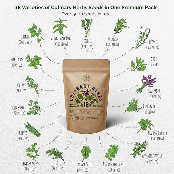 - 🍃Huge Value -18 Most Popular Culinary Herbs non-GMO Heirloom Seeds – LESS THAN $1.25 PER SEED VARIETY – OVER 5000 herbs seeds including: Basil, Catnip, Chervil, Chives, Cilantro (Coriander), Dill, Fennel, Thyme, Lavender, Lemon Balm, Oregano, Marjoram, Mountain Mint, Parsley, Rosemary, Sage, Summer Savory, Tarragon.