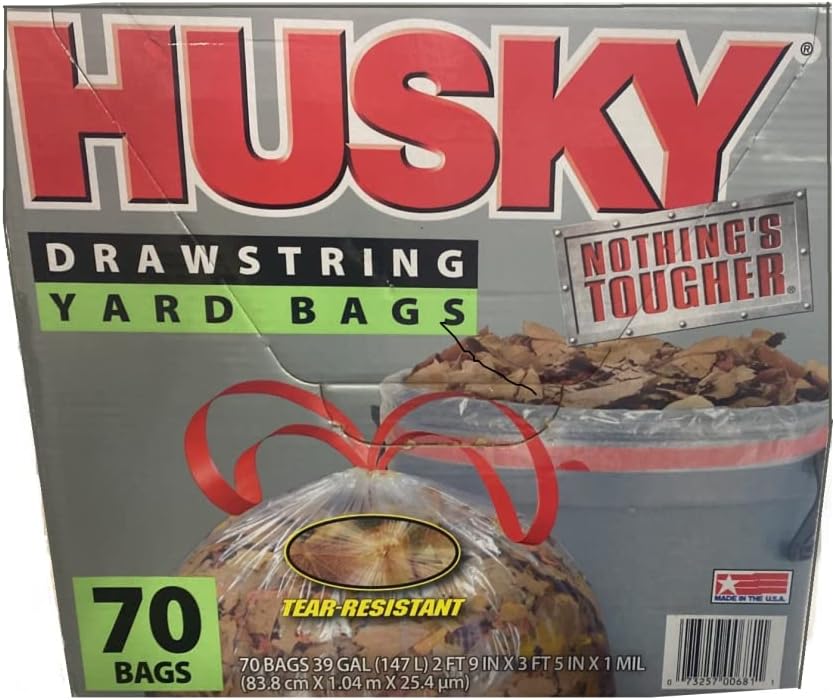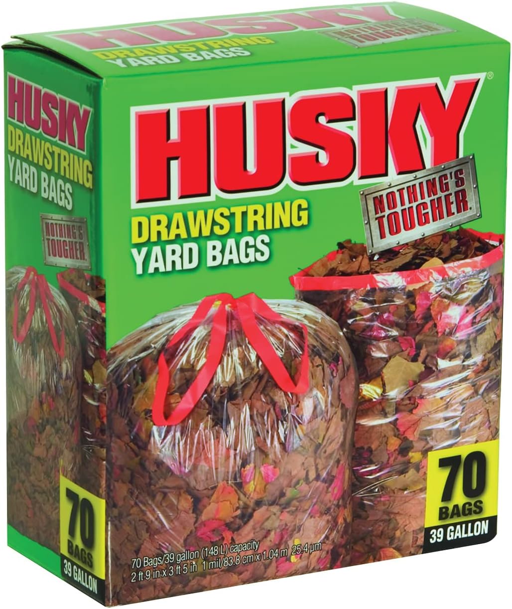 • Husky Yard Bag, 39 Gal Capacity, 3 Ft 4 In Length, 2 Ft 9 In Width, 1 Mil Thickness, Drawstring Closure, Clear, For Composting And Weeding