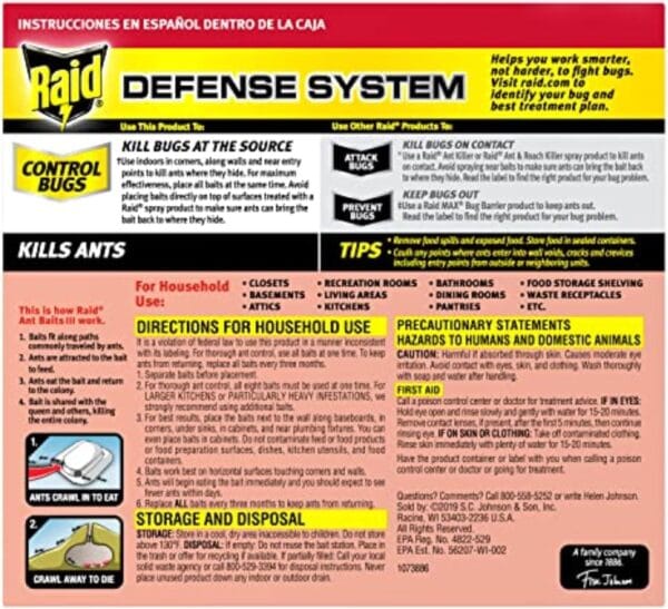 Control ants in your home with Raid Ant Killer Baits to kill ants where they hide for up to 3 months. After ants feed on this Raid Ant Bait, they return to the colony and transfer the bait to the queen and others, thereby killing the entire colony. Use this child-resistant Raid Ant Killer Bait in corners, along walls, and near entry points to kill ants where they hide. They’re safe to use in closets, basements, attics, rec rooms, kitchens, pantries, food storage shelving, and anywhere else you have issues with ants. Avoid placing these traps directly on top of surfaces treated with bug killer spray. For maximum effectiveness, place all of the Raid Ant Traps at the same time.