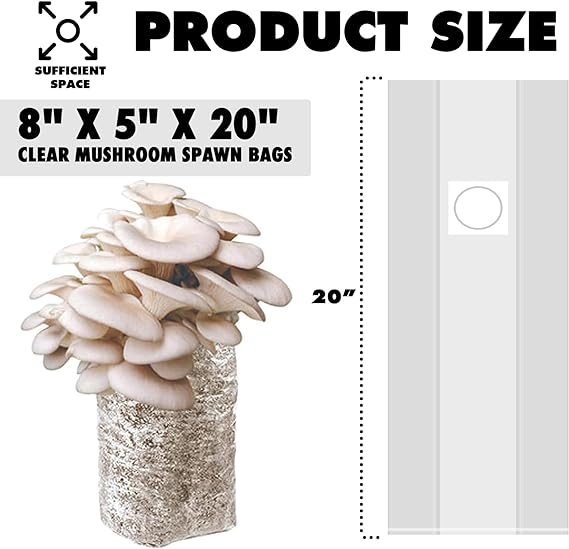 - LARGE 8″ X 5″ X 20″ CLEAR MUSHROOM SPAWN BAGS – Save a considerable amount of space by spawning and growing more mushrooms in one grow bag. At 6 inches long, 5 inches wide, and 20 inches high, these myco bags provide more than enough room for growing, spawning, and fruiting mushrooms. Even at this height, these side-gusseted bags can stand upright and hold the weight of their contents.