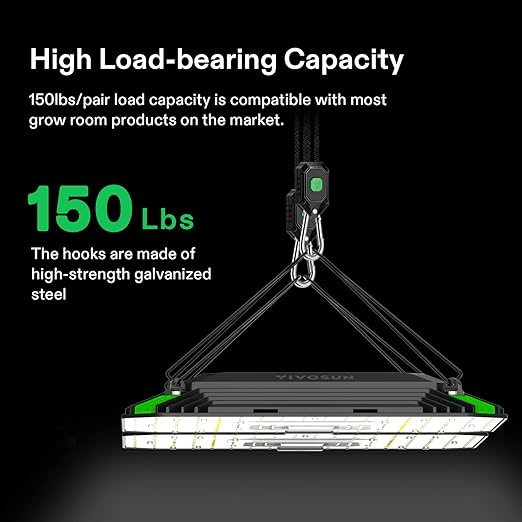- Exclusive Patented Design: (US Patent Number 10145543) With galvanized steel carabiners, reinforced metal internal gears and solid braided polypropylene rope, the VIVOSUN adjustable lightweight ratchet hangers have greater stability, flexibility, and longevity