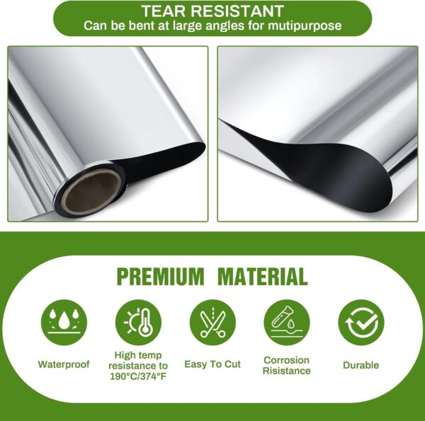 - Cuttable and Easy to Clean: this versatile aluminum paint coated film resistant to tear is not only reflective but also cuttable, plus, it’s incredibly easy to clean, adding a whole higher level of convenience; With our film roll, maintaining cleanliness with a damp cloth is as easy as a breeze